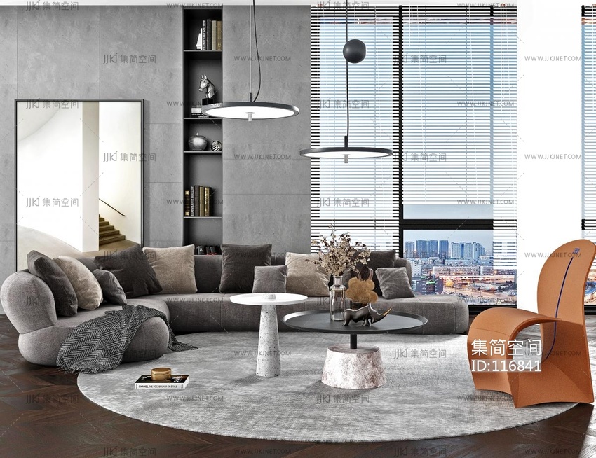 中古风客厅,美式客厅,圆形茶几,装饰画,移动电视,3d模型下载