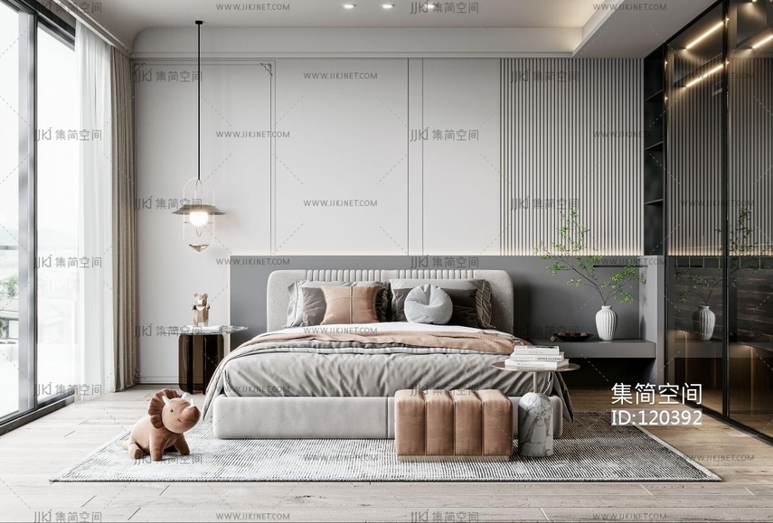 卧室,轻奢,暗黑风,现代轻奢卧室双人床,懒人沙发法式卧室3d模型下载