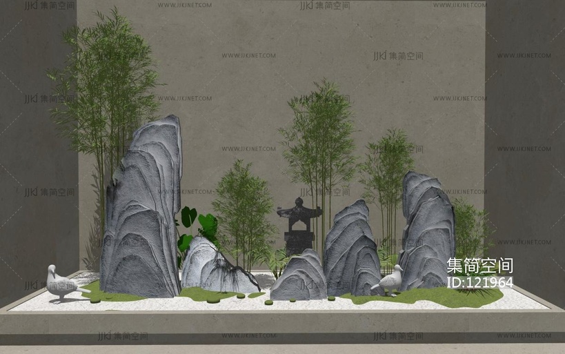 新中式假山景观小品,石头片石,竹子鸽子 su草图模型下载 [模型ID:121964]