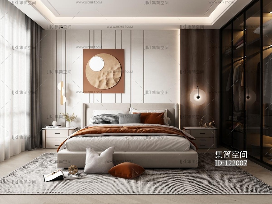 现代轻奢卧室,双人床,玻璃衣柜,床头柜 3d模型下载 [模型ID:122007]