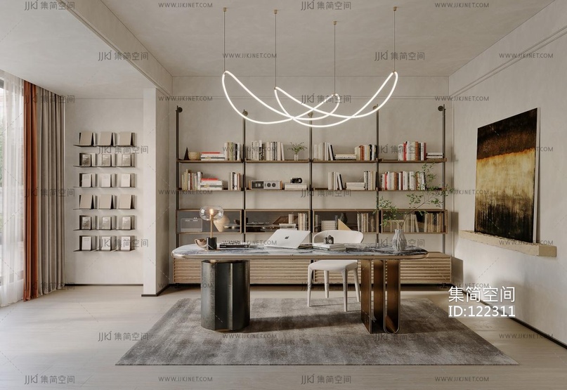 现代书房 书桌椅 壁柜 挂画 吊灯 书 盆栽 摆件3d模型下载
