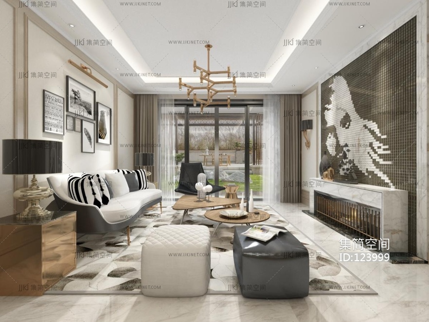 中古风客厅,美式客厅,圆形茶几,装饰画,移动电视,3d模型下载