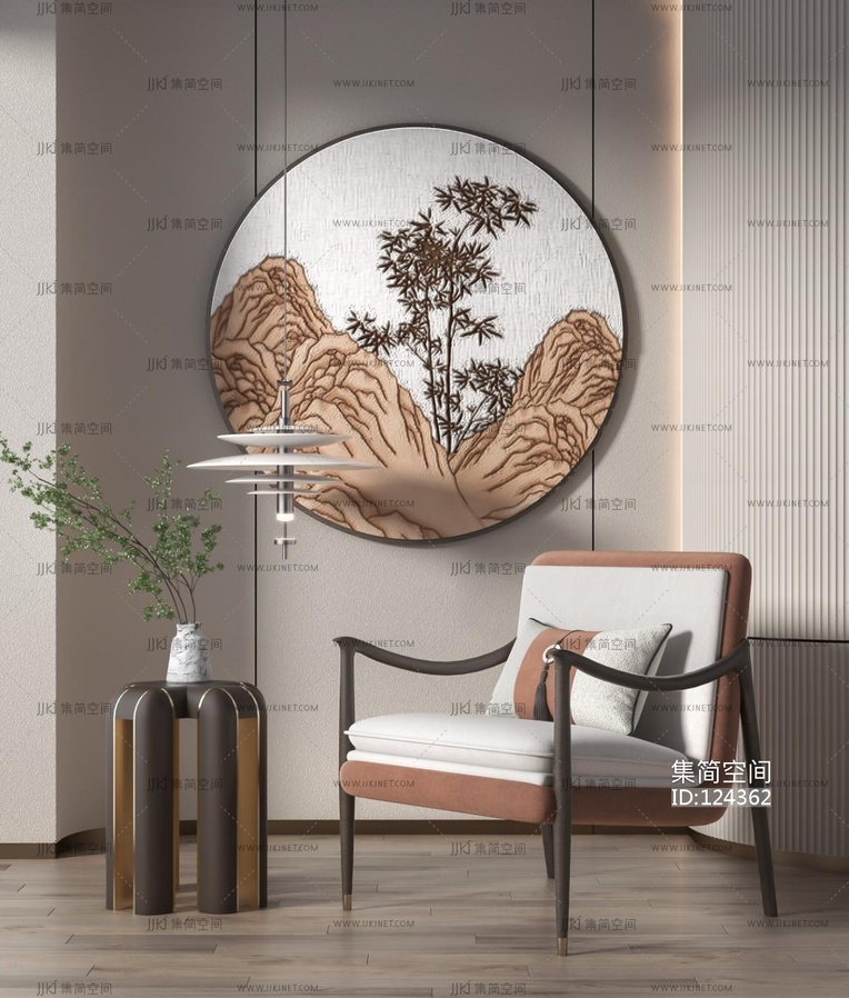 新中式单椅休闲椅边几组合 3d模型下载 [模型ID:124362]