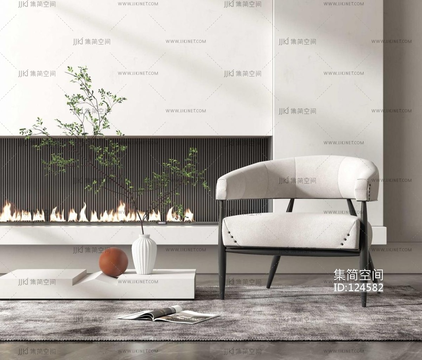 01-现代法式单人沙发_休闲椅_单椅_扶手椅圆形边几书本书籍玻璃水杯3D模型3d模型下载