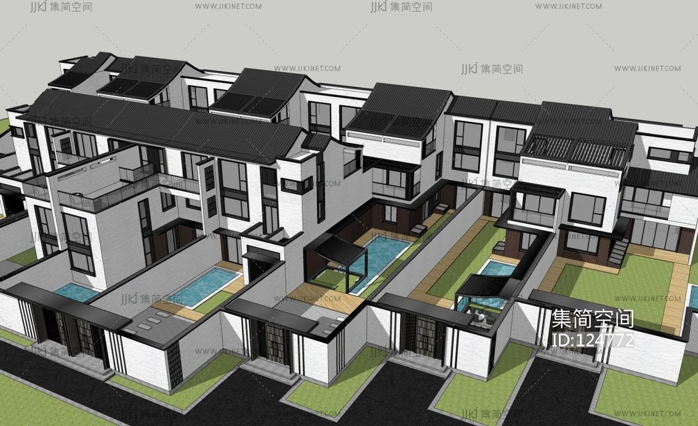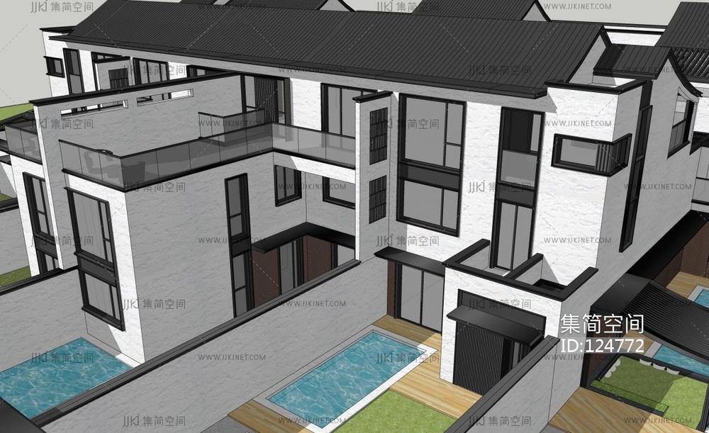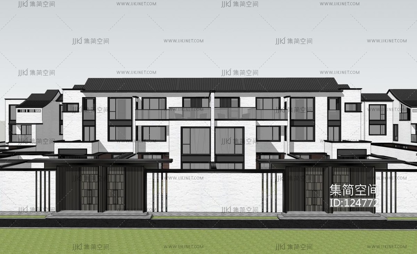 新中式别墅造型组团,院墙大门 su草图模型下载 [模型ID:124772]