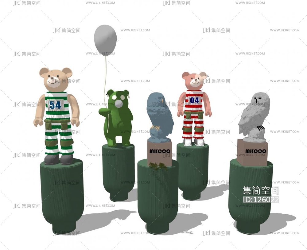 现代猫头鹰小熊暴力熊公仔潮玩雕塑饰品摆件 su草图模型下载 [模型ID:126022]