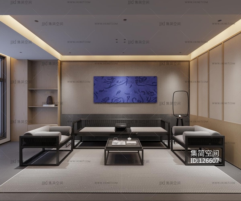 现代中式客餐厅,新中式沙发罗汉床茶几 3d模型下载 [模型ID:126607]