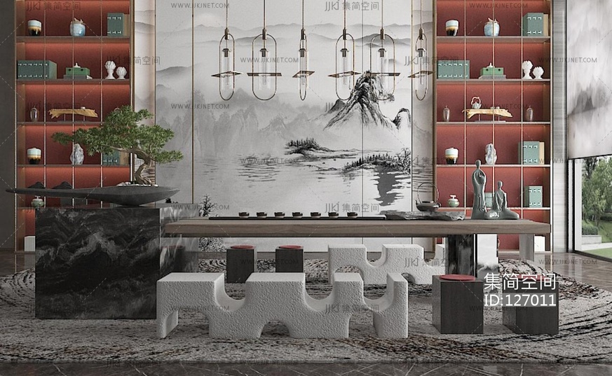 04新中式茶室,茶桌椅,茶台,盆景茶具茶壶 3d模型下载 [模型ID:127011]