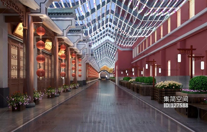 -新中式商业街马头墙,木花池花槽路灯 3d模型下载 [模型ID:127588]