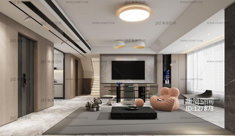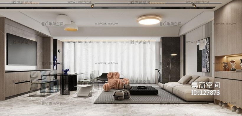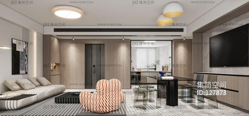 客餐厅现代客厅橱柜电视背景墙,奶油风休闲椅3d模型下载
