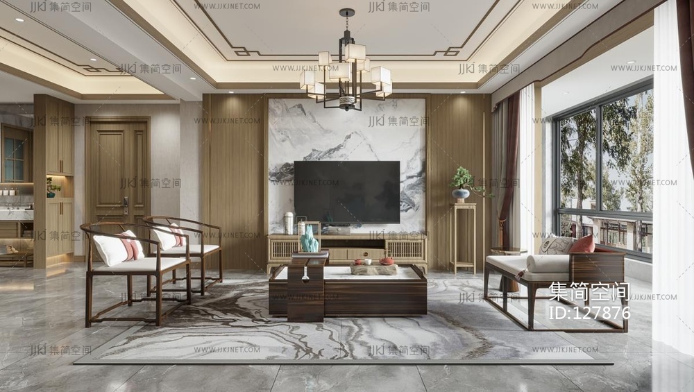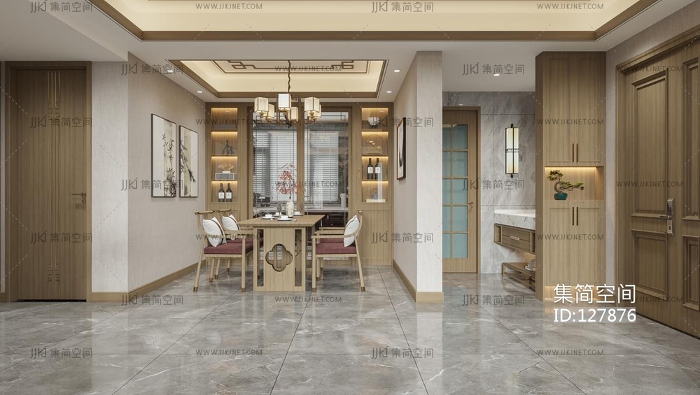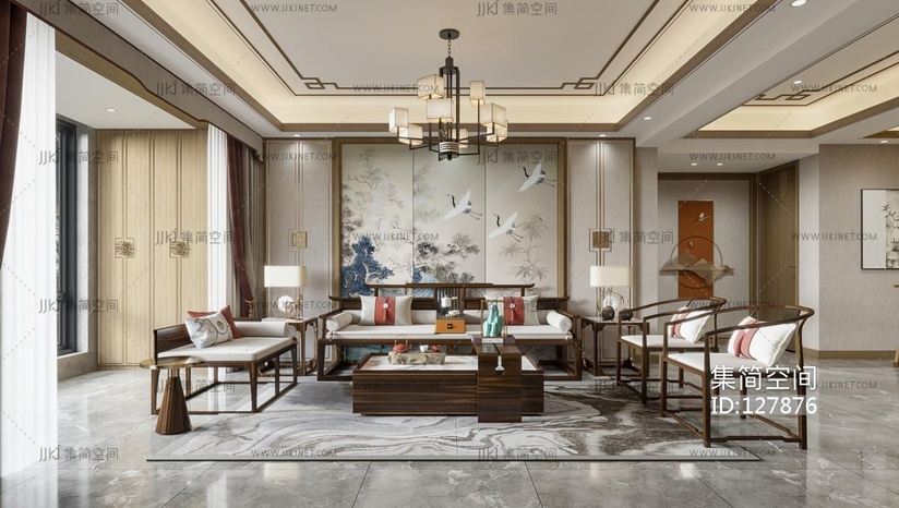 14新中式客餐厅,沙发茶几电视柜,餐桌椅 3d模型下载 [模型ID:127876]