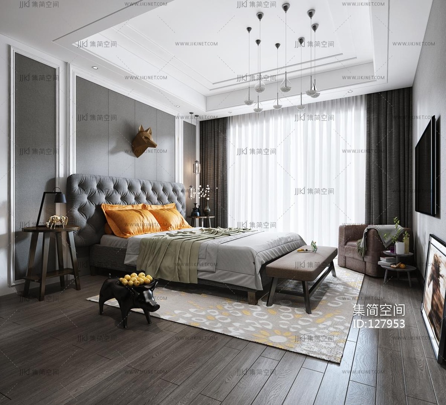 卧室,轻奢,暗黑风,现代轻奢卧室双人床,懒人沙发法式卧室3d模型下载