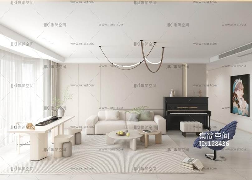 中古风客厅,美式客厅,圆形茶几,装饰画,移动电视,3d模型下载