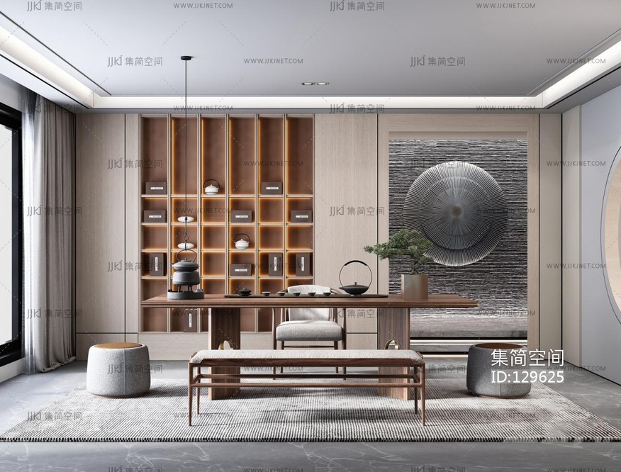 新中式茶室茶桌椅茶台,长条木凳子, 3d模型下载 [模型ID:129625]