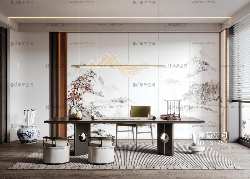 现代书房 书桌椅 壁柜 挂画 吊灯 书 盆栽 摆件3d模型下载