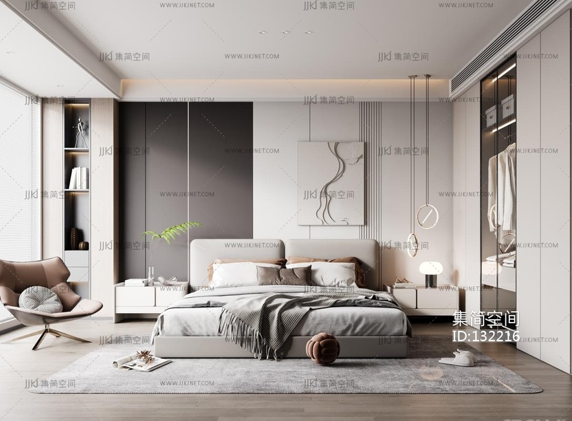 卧室,轻奢,暗黑风,现代轻奢卧室双人床,懒人沙发法式卧室3d模型下载