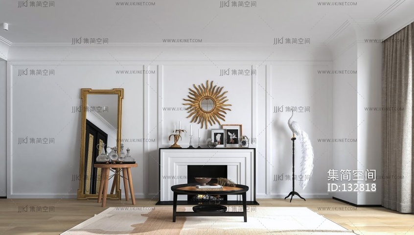中古风客厅,美式客厅,圆形茶几,装饰画,移动电视,3d模型下载
