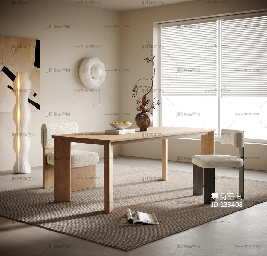 奶油风餐桌椅原木餐桌椅组合 3d模型下载 [模型ID:133408]