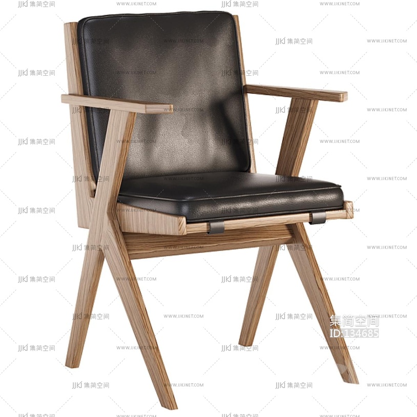 10现代栗木实木黑色皮革休闲椅3d模型下载