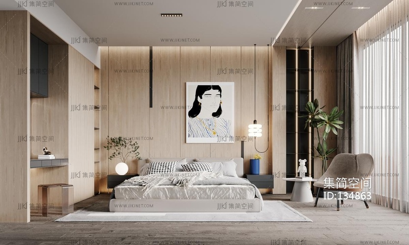 卧室,轻奢,暗黑风,现代轻奢卧室双人床,懒人沙发法式卧室3d模型下载