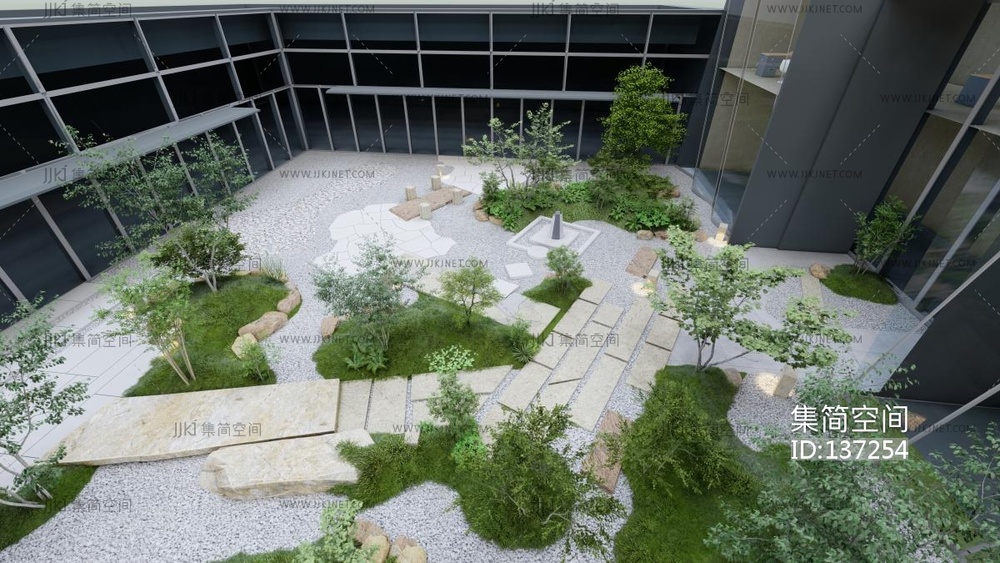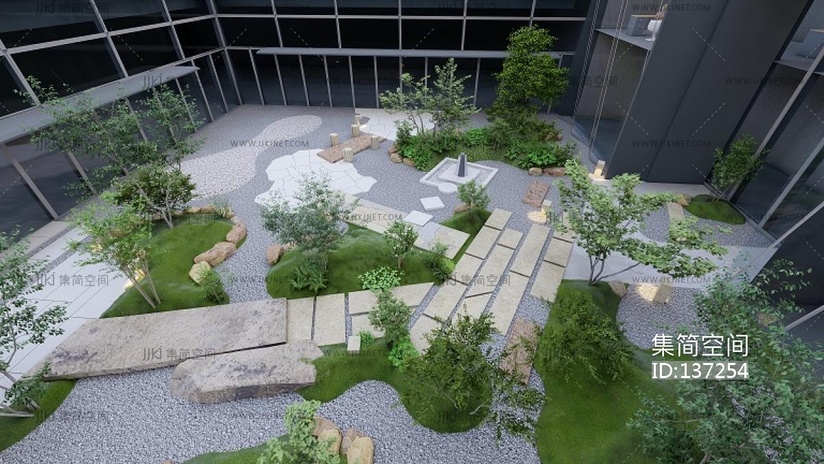 新中式禅意室内景观_景观造景_庭院景观_景观小品_天井室内景观_迎客松SU模型su草图模型下载