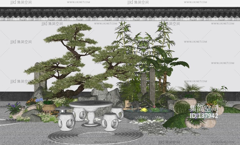 中式庭院小品植物水景 su草图模型su草图模型下载