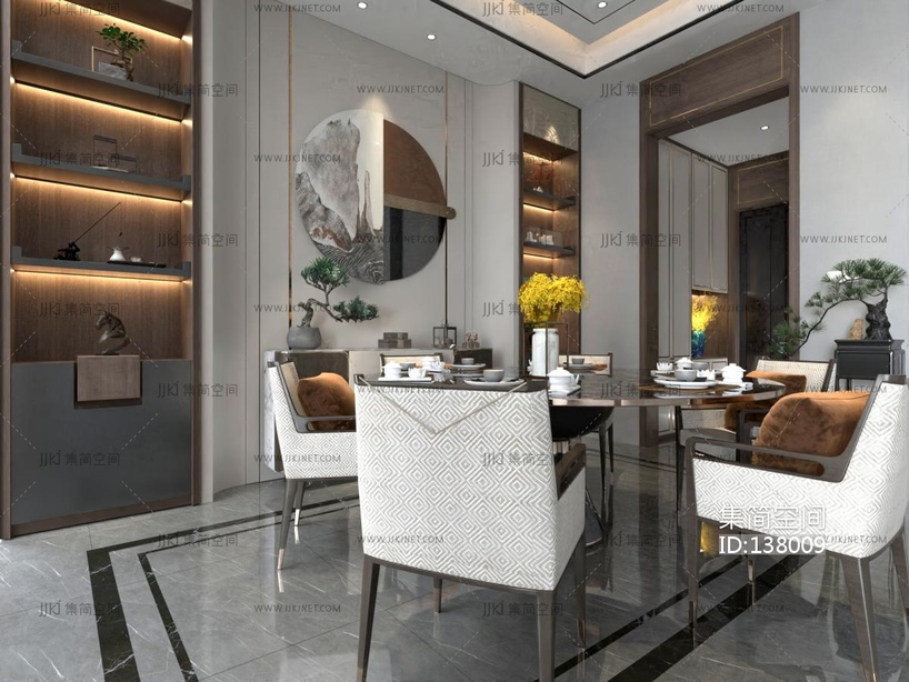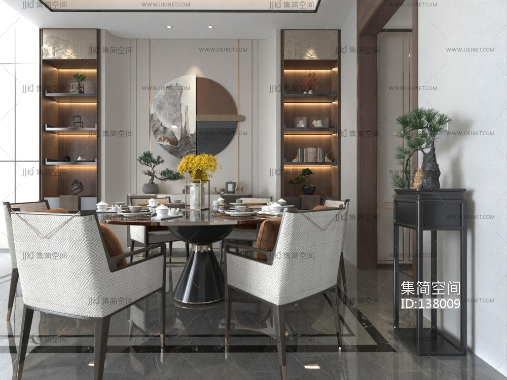 新中式餐厅,餐桌椅,圆形餐桌椅,摆台3D模型 3d模型下载 [模型ID:138009]