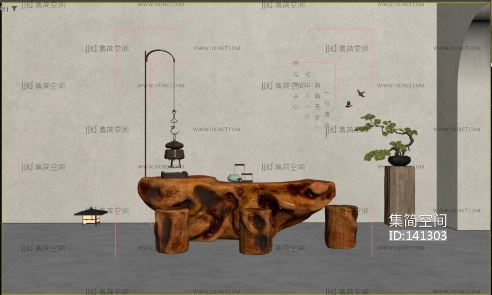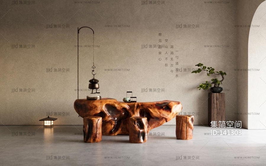 -侘寂茶桌椅组合_根雕_茶台_松树 3d模型下载 [模型ID:141303]