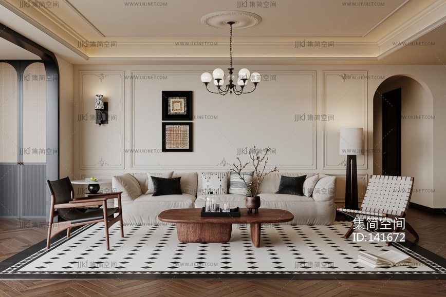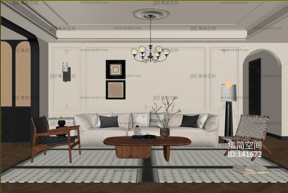 中古风客厅 沙发茶几组合 背景墙3d模型下载