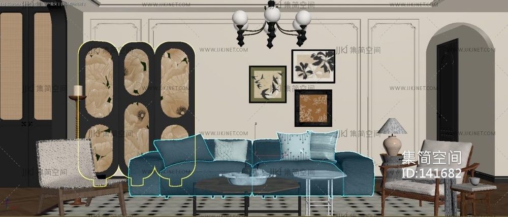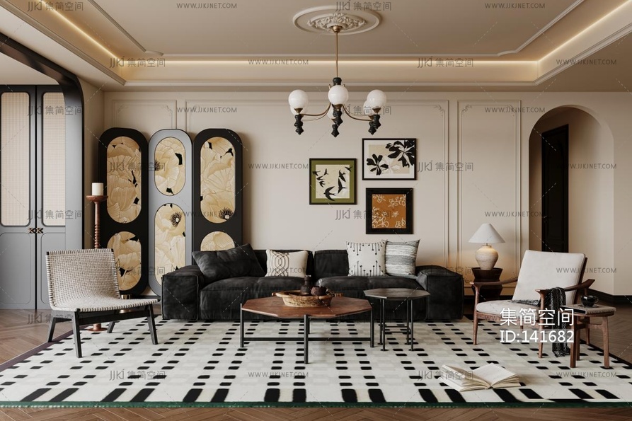 中古风客厅 沙发茶几组合 背景墙3d模型下载