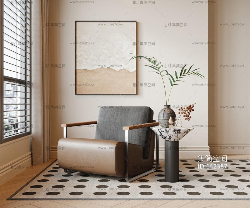 01-现代法式单人沙发_休闲椅_单椅_扶手椅圆形边几书本书籍玻璃水杯3D模型3d模型下载