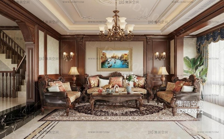 美式古典客餐厅 别墅 3d模型下载 [模型ID:142672]