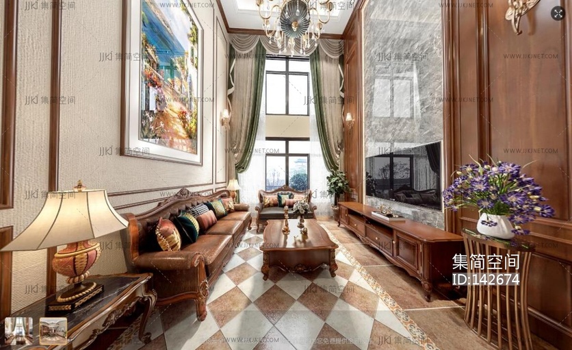 中古风客厅,美式客厅,圆形茶几,装饰画,移动电视,3d模型下载