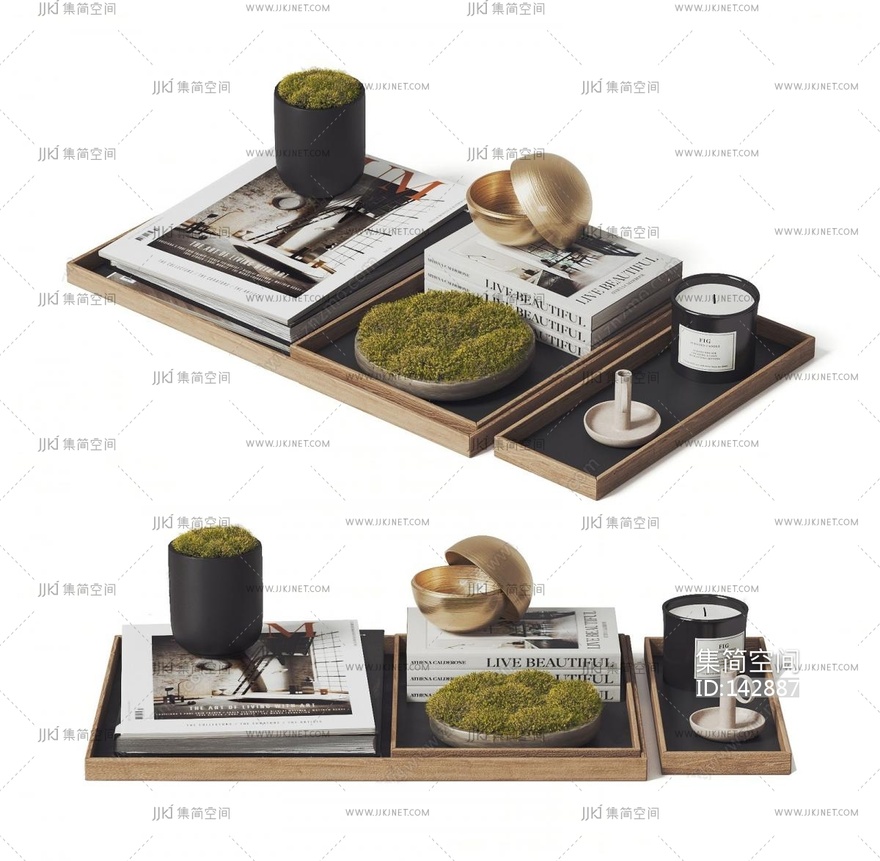 现代托盘摆件苔藓书籍书本酒店用品装饰组合3D模型3d模型下载