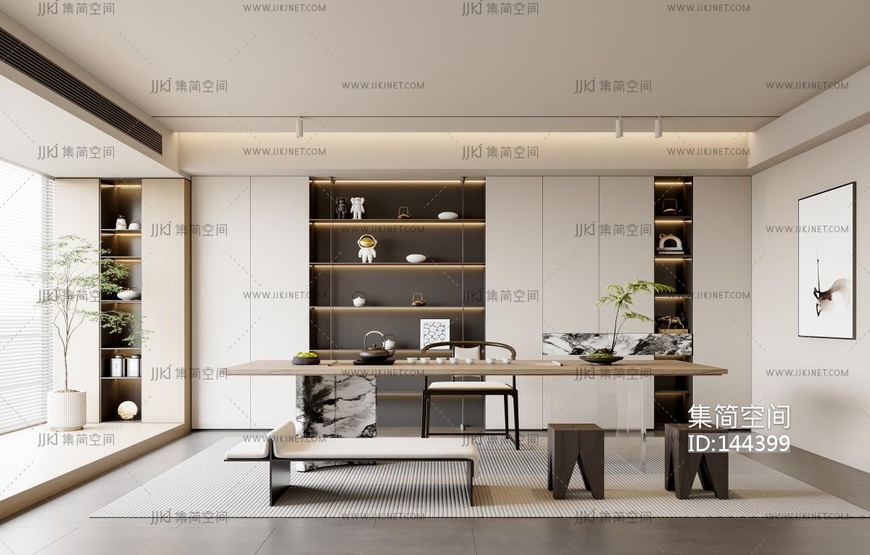 现代书房 书桌椅 壁柜 挂画 吊灯 书 盆栽 摆件3d模型下载