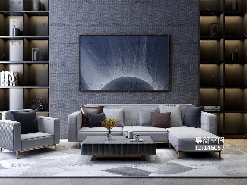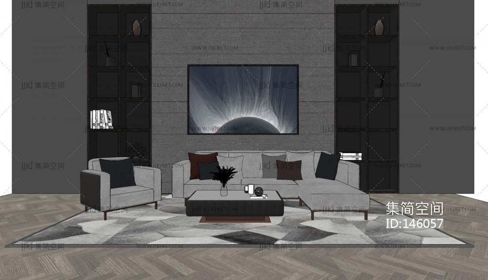 现代客厅 转角沙发 茶几组合 su草图模型下载 [模型ID:146057]