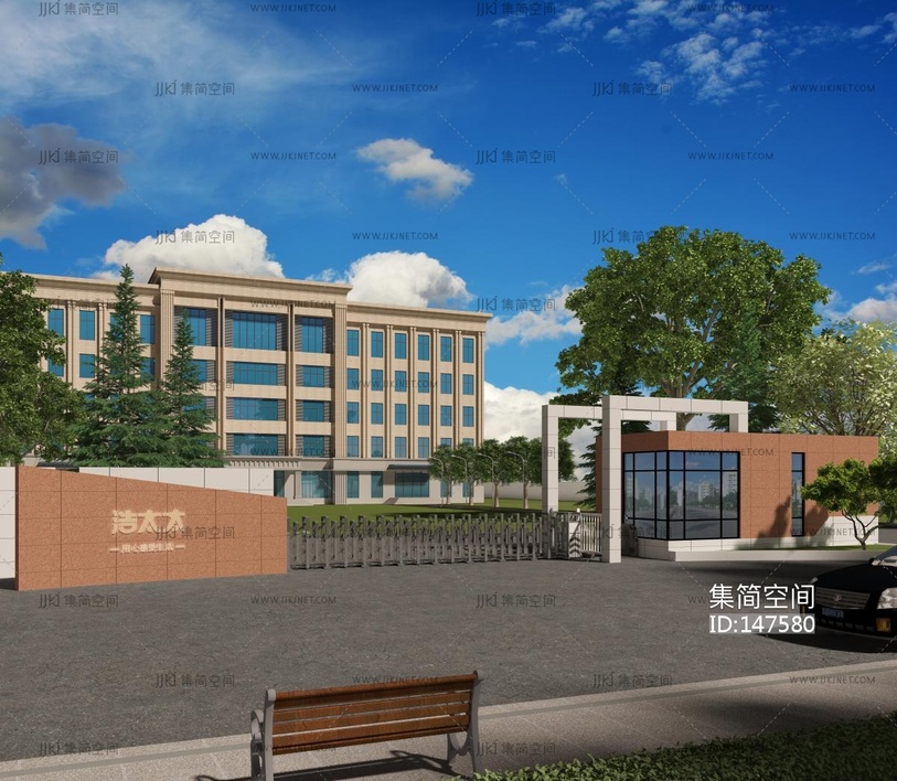 现代公司学校厂房大门门卫室道闸门 道闸栏杆 摆闸岗亭保安亭 伸缩门树路灯户外椅 3d模型下载 [模型ID:147580]