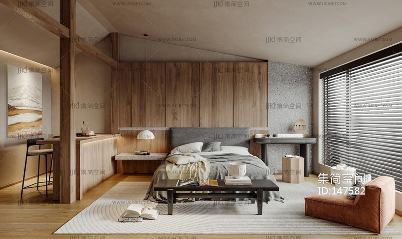 卧室,轻奢,暗黑风,现代轻奢卧室双人床,懒人沙发法式卧室3d模型下载