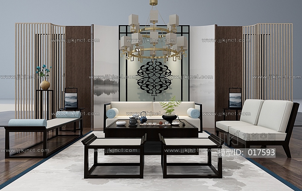 Z02-0105新中式沙发椅子茶几床尾踏客厅花架组合 3d模型下载 [模型ID:17593]