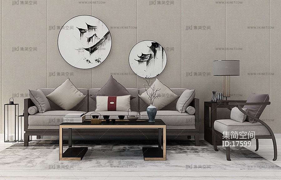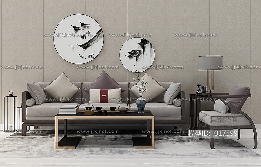Z14-0105新中式沙发茶几挂画马灯落地灯 3d模型下载 [模型ID:17599]