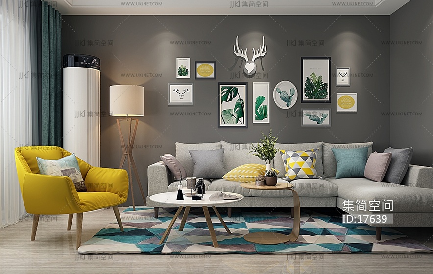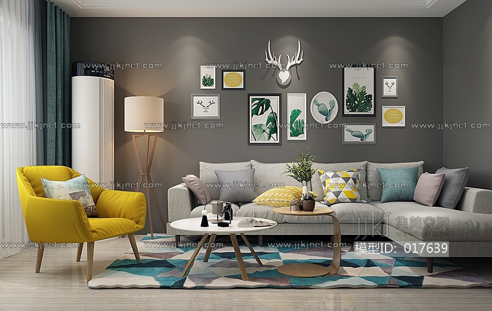 Z01-0109北欧沙发茶几落地灯空调挂画鹿头客厅 3d模型下载 [模型ID:17639]