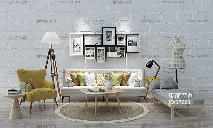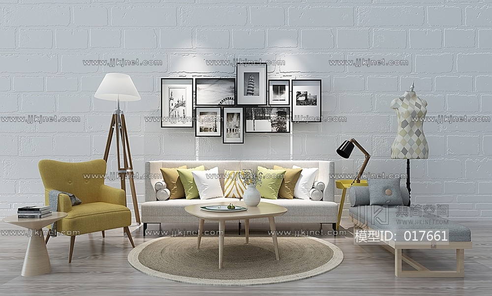 Z23-0109北欧沙发茶几落地灯休闲椅挂画组合 3d模型下载 [模型ID:17661]