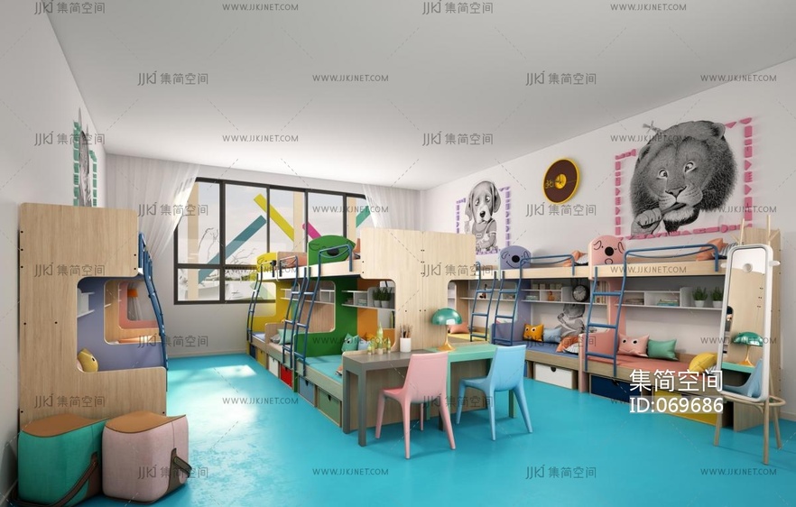 72幼儿园儿童休息室宿舍上下铺午休室学习桌椅 3d模型下载 [模型ID:69686]
