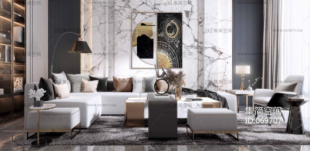 中古风客厅 沙发茶几组合 背景墙3d模型下载