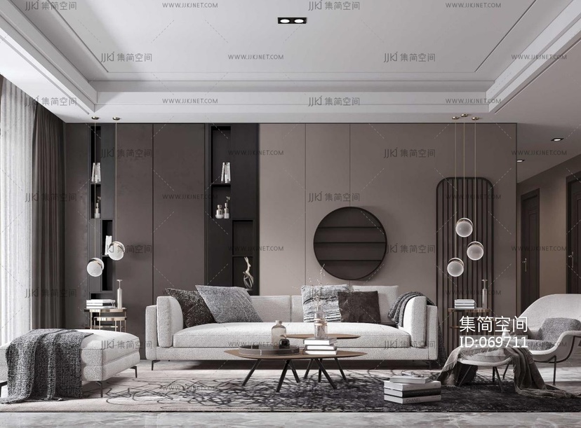 中古风客厅,美式客厅,圆形茶几,装饰画,移动电视,3d模型下载