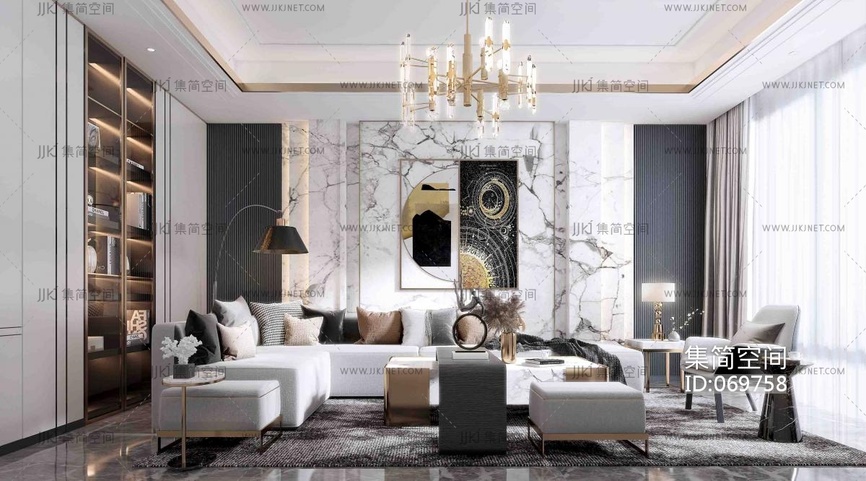 中古风客厅,美式客厅,圆形茶几,装饰画,移动电视,3d模型下载