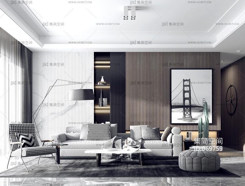 中古风客厅 沙发茶几组合 背景墙3d模型下载