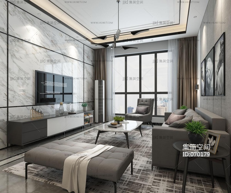中古风客厅,美式客厅,圆形茶几,装饰画,移动电视,3d模型下载
