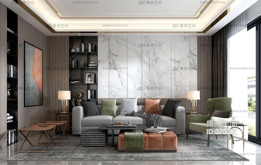中古风客厅 沙发茶几组合 背景墙3d模型下载