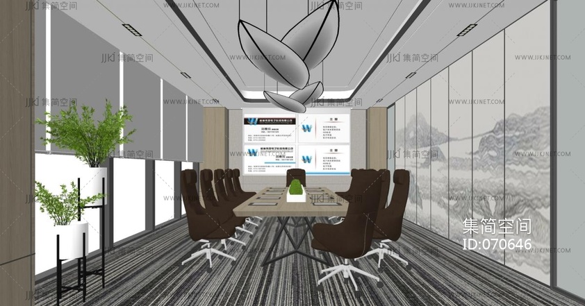 08现代小会议室会议桌椅树叶造型吊灯 su草图模型下载 [模型ID:70646]
